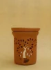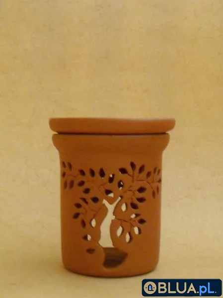 Gliniany kominek (podgrzewacz) do olejków eterycznych. Korpus wykonany jest z matowej gliny, z mocno ażurowym wzorem, górna miseczka na wodę jest od wewnątrz pokryta bezbarwnym szkliwem.