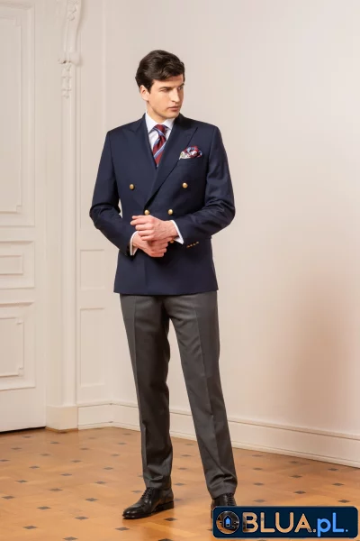 Czym jest marynarka klubowa Marynarka klubowa niewątpliwie jest jednym z niepodważalnych fundamentów współczesnej, klasycznej elegancji. Wywodząca się i kojarząca się ze stylem marynistycznym dwurzędowa, granatowa marynarka ze złotymi lub srebrnymi guzikami od dekad służy zarówno koronowanym głowom (chociażby wśród brytyjskiej rodziny królewskiej) jak i mężczyznom na całym świecie. Jak stylizować marynarkę klubową Wbrew pozorom marynarka klubowa daje naprawdę szerokie pole do popisu w kwestii stylizacji. Marynarkę tego typu zawsze stylizuje się ze spodniami z innej tkaniny i w innym kolorze niż sama "klubówka". Najbardziej popularne połączenie to eleganckie spodnie w dowolnym odcieniu szarości (od bardzo jasnej szarości do ciemnego grafitu). W sezonie wiosenno-letnim równie trafnym uzupełnieniem stylizacji będą beżowe lub białe spodnie typu ghurka. Zimą wykorzystanie spodni ze wzorem szkockiej kraty, wełnianej flaneli lub brytyjskiego bądź irlandzkiego tweedu również będzie dawać piorunujące wrażenie. Marynarka dwurzędowa klubowa VAN THORN Marynarka dwurzędowa klubowa to bezkompromisowa klasyka. Uszyta z włoskiej wełny 130's o gramaturze 250g/m2 od Fratelli Tallia di Delfino jest uniwersalną całoroczną propozycją. Szerokie na 12 cm, frakowe wyłogi optycznie podkreślają klatkę piersiową oraz barki i razem z linią wyznaczoną przez złote guziki podkreślają tak pożądany przez mężczyzn kształt sylwetki typu "V". Ponadczasowe stylizacje od VAN THORN Klasyczna elegancja to fundament na którym stoi świat współczesnej mody męskiej. Specjaliści VAN THORN w Warszawie oraz Gdyni czerpią z tych podstaw pełnymi garściami, aby tworzyć wyjątkowe propozycje dopasowane do indywidualnych potrzeb i oczekiwań każdego mężczyzny. W przypadku szycia na miarę w pracowniach VAN THORN na bazie przedstawionego modelu cena realizacji związana jest z dopłatą minimum 10% w zależności od indywidualnej konfiguracji.