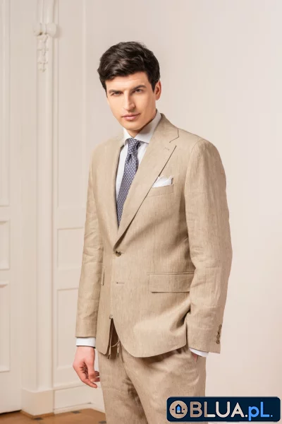 Marynarka lniana - podstawa wakacyjnej luźnej elegancji Latem bywa naprawdę gorąco - taki mamy klimat. Dlatego w codziennych stylizacjach do pracy, na luźne spotkania lub gdy chcemy pobawić się sportową elegancją nie ma nic lepszego niż marynarka lniana beżowa. Uszyta z lnianej tkaniny o gramaturze 270g/m na płótnie w technologii half canvas marynarka VAN THORN będzie niezastąpionym elementem stylizacji w upalny dzień. Z czym łączyć marynarkę lnianą? Dla własnego komfortu przede wszystkim z lekkimi przewiewnymi tkaninami. Koszula o otwartym, przewiewnym splocie, lekkie chino, ulubione jeansy lub spodnie z wełny o splocie typu tropik. Ze względu na nieformalny charakter lnianej marynarki zarówno boat shoes, loafersy, monki czy sneakersy jak najbardziej będą właściwym wyborem. W kwestii kolorów i wzorów wręcz wskazana jest nutka wakacyjnego szaleństwa. W przypadku szycia na miarę w pracowniach VAN THORN na bazie przedstawionego modelu cena realizacji związana jest z dopłatą minimum 10% w zależności od indywidualnej konfiguracji.