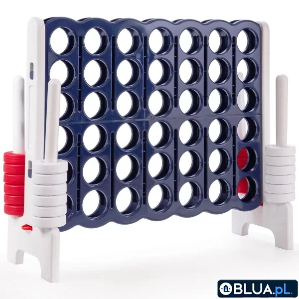 Duża gra 4 w rzędzie dla dzieci i dorosłych Nasz zestaw do gry 4 w rzędzie przyniesie wiele radości całej rodzinie. Podczas gdy mniejsze dzieci uczą się gry, ćwiczą przy tym koordynacje wzrokowo-ruchową, a także rozwijają przy tym umiejętności pracy zespołowej. Wysokość tablicy wynosi 104 cm, dzięki czemu nadaje się do użytkowania przez dzieci i dorosłych. Cały zestaw wykonany został z wysokiej jakości materiałów PE i PP, które zapewniają długą żywotność. Duży zestaw: Nasza duża gra „4 w rzędzie” przystosowana jest do zabawy w domu, w ogrodzie, na przyjęciach urodzinowych oraz na grillu. Dzięki tej rozrywce dzieci poprawią zdolności motoryczne, koordynację wzrokowo-ruchową, a także zdolności poznawcze. Wysoka jakość wykonania i trwałe materiały: Cały zestaw wykonany został ze starannie dobranych materiałów, dzięki czemu jest całkowicie bezpieczny w użytkowaniu. Wysokiej jakości materiały PE i PP są wyjątkowo trwałe i zapewniają długą żywotność. Ponadto wszystkie krawędzie planszy zostały odpowiednio wyprofilowanie, co zapobiega przypadkowym urazom podczas zabawy. Niewielka waga i prosty transport: Dzięki zastosowaniu wysokiej jakości materiałów z tworzyw sztucznych, cały zestaw do gry waży jedynie 11,2 kg. Ta niewielka waga i przenośna konstrukcja sprawiają, całość można zabrać ze sobą w dowolne miejsce. Prosty montaż i czyszczenie: Zestaw jest prosty w montażu i demontażu w ciągu kilku minut. Cały proces nie wymaga żadnych dodatkowych narzędzi. Utrzymanie w czystości jest także niezwykle proste przy użyciu jedynie wilgotnej ściereczki. Doskonały prezent: Nasza gra „4 w rzędzie” jest idealnym prezentem dla dzieci. Niezależnie od okoliczności, zestaw ten będzie zawsze ogromną niespodzianką i zapewni im wiele godzin zabawy. Zasady gry są niezwykle proste, dzięki czemu każdy może nauczyć się ich w krótkim czasie. Dwa czerwone suwaki na dole pomagają natychmiast rozpocząć grę. Paczka z produktem zawiera: 1 x plansza do gry 21 x białe krążki 21 x czerwone krążki 2 x podpórki 2 x suwaki