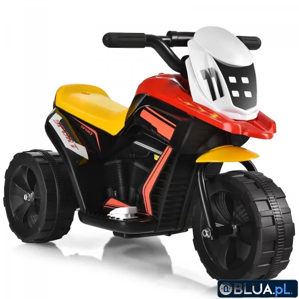 Zabawkowy motor dla dzieci 3-latka Twoje dziecko kocha motoryzację i już od najmłodszych lat marzy o posiadaniu własnego pojazdu? Zabawkowy motor dla dzieci powstał z myślą o najmłodszych użytkownikach. Cechuje się on dość realistyczną, solidną konstrukcją, utrzymującą ciężar ciała do 25 kg. Został wyposażony w akumulator, dzięki czemu rzeczywiście jeździ, dając niesamowitą frajdę małym kierowcom. Baterie można bardzo łatwo naładować, by kontynuować zabawę niezależnie od okazji. Motor sprawdza się zdecydowanie najlepiej na twardym, gładkim podłożu bez żadnych nierówności, które mogłyby wpłynąć na sposób kręcenia się kół oraz komfort poruszania się. Funkcjonalny motor zabawkowy dla dzieci w atrakcyjnym wydaniu Motocykl dla 3-latka powinien być przede wszystkim atrakcyjny pod względem wizualnym. Z tego powodu górną część produktu wykonano z tworzywa sztucznego w kolorze żółtym i czerwonym. Pozostałą część utrzymano w barwie czarnej, przypominającej prawdziwe pojazdy tego typu. Motor dla dzieci w wieku od 3 do 5 lat gwarantuje również dodatkowe udogodnienia – został wyposażony w antypoślizgowe pedały, przełączniki do przodu i do tyłu oraz kierownicę. Wszystkie te elementy pozwalają na swobodne zmienianie kierunku jazdy, dzięki czemu dziecko może uczyć się manewrować pomiędzy przeszkodami i naśladować jazdę z wykorzystaniem prawdziwego motocykla dla dorosłych. Co więcej, motor zabawkowy dla dzieci zawiera także klakson i specjalny przycisk z muzyką, który odtwarza dźwięki podobne do warkotu prawdziwego pojazdu. Wszystkie te udogodnienia sprawiają, że jest to zabawka idealna dla najmłodszych użytkowników, kochających emocjonujące atrakcje związane z motoryzacją. Cechy Wspaniały prezent: Realistycznie wyglądający motocykl z silnikiem elektrycznym i wygodnym siedzeniem, stworzony z myślą o dzieciach powyżej 3 roku życia. Idealny prezent dla chłopców i dziewczynek Duże koła zapewniające bezpieczną jazdę: 3 duże koła z głębokim bieżnikiem wykonane z wysokiej jakości materiału PP są odporne na zużycie. Cechują się kontrolą jazdy, dzięki czemu maluch może jeździć wygodnie i bezpiecznie przez długi czas. Ten motocykl jest dedykowany na gładkie i twarde podłoże a jego maksymalne obciążenie to 25 kg. Nauka i rozrywka: Dzieci mogą kierować motocyklem za pomocą antypoślizgowych pedałów, przełączników do przodu i do tyłu oraz komfortowej kierownicy. Ponadto, dzięki klaksonowi i przyciskowi z muzyką, ten mini motocykl będzie odtwarzał realistyczne efekty dźwiękowe i muzykę podczas jazdy. Wygodna i bezpieczna konstrukcja: Trzy koła zapewniają stabilność podczas jazdy, przechylania się i ogólnej zabawy, co w efekcie chroni dziecko przed przewróceniem siebie i zabawki. Przygotowanie: Zabawka jest gotowa do naładowania prosto z paczki. Akumulator 6 V z bezpośrednim podłączeniem do ładowania gwarantuje niemal niekończącą się zabawę i powszechne opcje ładowania akumulatora „na wyciągnięcie ręki”.