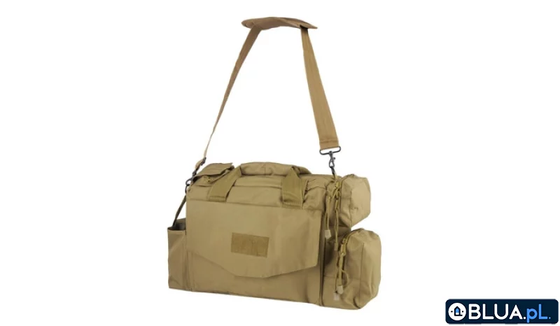 Torba transportowa wykonana w 100 % z wytrzymałego poliestru, który dodatkowo został pokryty warstwą polichlorku winylu (PVC). Zamykana klapą na podwójny zamek błyskawiczny, zabezpieczony rzepem. Duża komora główna posiada możliwość podziału na dwie mniejsze, dzięki przegrodzie mocowanej na rzep. Spora, płaska frontowa kieszeń posiada panel rzepowy do spersonalizowania torby. Na tylnej stronie umieszczono cztery kieszenie różnych wielkości. Pod płaską klapą znajduje elastyczne paski na długopisy, nóż składany lub multitoola. Obok niej długa, wąska otwarta kieszeń na takie elementy wyposażenia jak latarka czy tłumik dźwięku. Po prawej stronie znajduje się zasobnik na dwa magazynki a pod nim miejsce na kajdanki zapinane klapką na rzep. Po bokach znajdują się trzy dodatkowe przegrody. Dwie zamykane na dwukierunkowy zamek oraz jedna zabezpieczona trokiem na rzep. Torbę można przenosić na ramieniu za pomocą regulowanego pasa lub trzymając w dłoni za dwa uchwyty transportowe umieszczone po bokach. Cechy: Torba wykonana z solidnego poliestru Obszerna komora główna z możliwością podziału Duża płaska frontowa kieszeń Na tylnej ściance umieszczono kieszeń na kajdanki, dwie pojedyncze ładownice na magazynek pistoletowy i organizer Na jednym z boków zlokalizowano dwie kieszenie zapinane na zamek, na drugim przedział zabezpieczony trokiem Regulowany wygodny pas naramienny Dwa uchwyty transportowe splitter Dane techniczne: Materiał100% Poliester powleczony PVC Wymiary45 x 22 x 30,5 cm Wielkość laptopado 15,6'' Waga2510 g Kolor Coyote