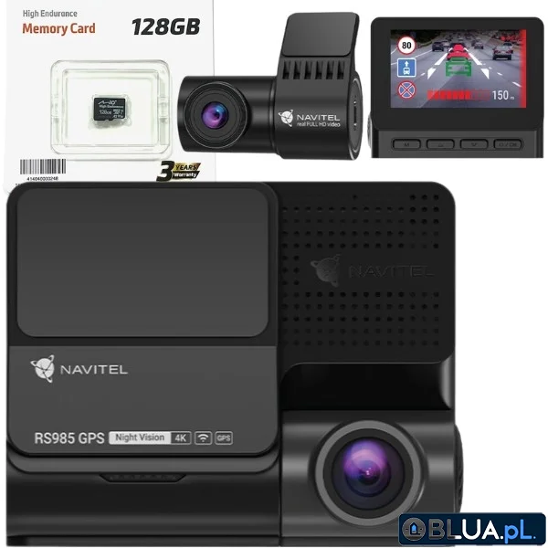 Zestaw Wideorejestrator NAVITEL RS985 GPS Duo (przód + tył) 4K, HDR, ADAS, prędkościomierz, mapy Europy + karta 128 GB