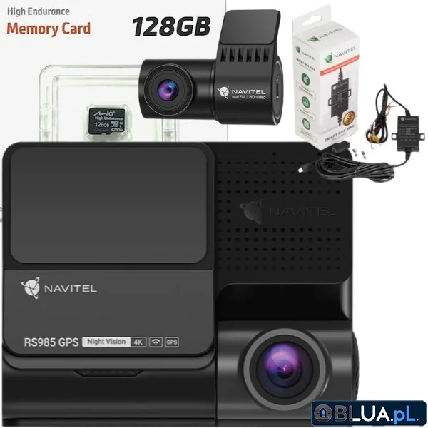 Zestaw Wideorejestrator NAVITEL RS985 GPS Duo (przód + tył) 4K, HDR, ADAS + adapter zasilania Smartbox NAVITEL + karta 128 GB
