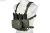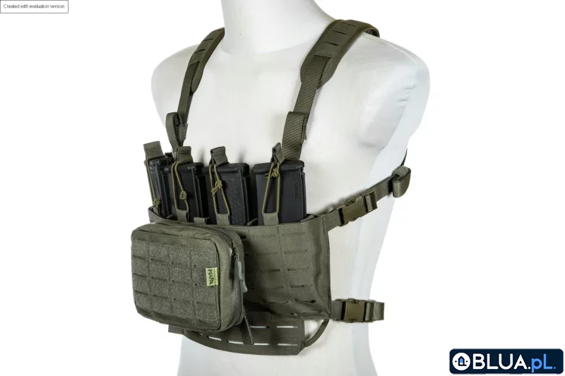Chest Rig wykonany z laminatu podwójnej warstwy Cordura 560 z laserowo wycinanym systemem MOLLE, który pozwala na dowolne dostosowanie ekwipunku do strzelca. Razem z kamizelką w zestawie znajduje się ładownica cargo, pozwalająca również na doczepienie akcesoriów na panelu laser-cut oraz kieszeń przystosowana do montażu wkładek na magazynki.