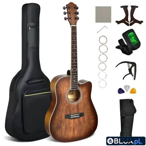 Gitara akustyczna Nasza gitara akustyczna z zestawem akcesoriów to świetny wybór zarówno dla początkujących, jak i doświadczonych muzyków. Wyselekcjonowane materiały i doskonałe wykonanie gwarantują długie lata użytkowania i przyjemność z gry. Wyprofilowane pudło rezonansowe z krzyżowymi wzmocnieniami daje piękny, jasny dźwięk, a wcięcie przy gryfie pozwala łatwiej sięgać do niskich progów. Gładka podstrunnica nie narazi cię na otarcia palców, a oznaczenia progów ułatwią naukę początkującym. Stalowe struny są mocniejsze niż nylonowe i lepiej trzymają naciąg - z łatwością nastroisz je za pomocą doskonałych kluczy. W zestawie znajdziesz wszystkie potrzebne akcesoria: wygodny plecak, stroik cyfrowy, pasek, kostki, kapodaster, szmatkę do polerowania, stojak, zapasowy komplet strun oraz klucz imbusowy do regulacji gryfu. 9-częściowy zestaw akcesoriów: Oprócz gitary dostarczymy ci plecak, stroik cyfrowy, zapasowe struny, szmatkę do polerowania, stojak i nie tylko. Bogaty zestaw zadowoli zarówno zaawansowanych, jak i początkujących muzyków, którym pozwoli na rozpoczęcie przygody z gitarą. Najlepsze materiały: Nasza gitara zbudowana jest z wyselekcjonowanego drewna lipowego, które zapewnia świetne przenoszenie dźwięku i czysty ton, a gładka podstrunnica i stalowe struny to większa przyjemność z gry i mniejsze ryzyko obolałych palców. Łatwe strojenie i regulacja: Cyfrowy stroik pozwoli ci z łatwością nastroić gitarę, a mocne, stalowe struny doskonale trzymają strój. W zestawie znajdziesz klucz imbusowy, którym samodzielnie wyregulujesz akcję strun, by dopasować ją do swoich preferencji i uniknąć irytującego efektu brzęczenia. Praktyczne detale: Aby ułatwić naukę gry na podstrunnicy umieściliśmy oznaczenia pozycji progów 3, 5, 7, 9, 12, 15 i 17. Półokrągły gryf z egzotycznego drewna okoume zapewnia pewny chwyt. Klasyczny wygląd, przyjemność z gry: Wycięcie pudła to nie tylko świetny wygląd, ale też ułatwienie przy sięganiu do niższych progów i graniu solówek. Doskonałe brzmienie pozwoli ci odkryć szeroką gamę gatunków muzycznych, takich jak blues, rock i inne. Opakowanie zawiera: 1 x Gitara 1 x Plecak 1 x Pasek 1 x Stroik cyfrowy 1 x Kapodaster 1 x Zapasowy komplet strun 3 x Kostka 1 x Szmatka do polerowania 1 x Klucz imbusowy 1 x Stojak