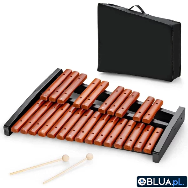 Ksylofon chromatyczny dwuoktawowy dla dzieci i dorosłych Nasz ksylofon to doskonały wybór zarówno dla dzieci jak i dorosłych. Dwa rzędy płytek z 25 tonami dają wiele możliwości komponowania własnych utworów jak i odtwarzania muzyki z nut. Wysokiej jakości drewno zapewnia długą żywotność i przyjemny, melodyjny dźwięk, a podstawa jest mocna i stabilna. Zaokrąglone krawędzie i gładka powierzchnia płytek to gwarancja bezpieczeństwa nawet dla najmłodszych dzieci. W zestawie znajdziesz praktyczny pokrowiec i 2 pałeczki. Instrument jest odpowiedni dla początkujących i bardziej zaawansowanych muzyków i świetnie sprawdzi się w domu, klasie szkolnej oraz zespole muzycznym. 25 tonów, 2 oktawy: Nasz ksylofon to niesztampowy instrument, który uwrażliwi dziecko na muzykę. Melodyjne dźwięki wydawane przez 25 drewnianych płytek i prosta technika gry z pewnością zachęcą twoją pociechę do wyrażania siebie i sprawią, że ćwiczenia nie będą uciążliwe. Doskonałe wykonanie: Płytki z twardego drewna są trwałe i odporne na uszkodzenia, a ich gładka powierzchnia i zaokrąglone krawędzie są bezpieczne nawet dla najmłodszych dzieci. Podstawa z pełnego drewna sosnowego gwarantuje stabilność instrumentu. Jeden instrument, wiele zastosowań: Nasz produkt jest odpowiedni zarówno dla początkujących jak i zaawansowanych muzyków. 2 oktawy oferują bogate możliwości tworzenia muzyki i gry z nut, dzięki czemu instrument sprawdzi się w szkole muzycznej, do domowych ćwiczeń oraz jako element większego zespołu. Niewielkie wymiary, łatwy transport: Wygodny pokrowiec umożliwia zabranie instrumentu do szkoły lub na występ, a jego niewielkie wymiary i płaski kształt ułatwiają jego przechowanie. Kompletny zestaw: W zestawie oprócz ksylofonu otrzymasz pokrowiec i 2 drewniane pałeczki o długości 20 cm, dzięki czemu możesz zacząć przygodę z muzyką tuż po rozpakowaniu. Prosta instrukcja podpowie ci, jak zadbać o instrument. Opakowanie zawiera: 1 x Ksylofon 2 x Pałeczka 1 x Pokrowiec 1 x Instrukcja