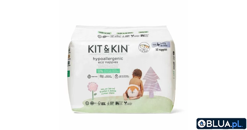 Opakowanie: pieluchy rozmiar 4, 32 sztuki w opakowaniuSuperchłonne, biodegradowalne i hipoalergiczne jednorazowe pieluszki dostępne w 5 rozmiarach. Skóra dziecka może w nich swobodnie oddychać i nie ma kontaktu ze szkodliwymi substancjami chemicznymi. Pieluszki wykonane bez użycia chloru, wybielaczy, ftalanów, lateksu, sztucznych substancji zapachowych oraz najbardziej popularnych alergenów dodawanych do popularnych “jednorazówek”. Wielokrotnie nagradzane za wysoką jakość oraz piękny wygląd.Pieluszki zostały stworzone przez wokalistkę zespołu Spice Girls, a obecnie mamę- Emmę Lee Bunton. Wszystko zgodnie z zasadą, aby było lepiej dla dziecka oraz dla środowiskaWarstwa Flash Dry „Błyskawicznie sucha”Wierzchnia warstwa naszej pieluszki jest wykonana z błyskawicznie schnącego materiału, który szybko wchłania płyn i zapewnia dziecku dodatkowy komfort. Przy czym nadal pozostają wyjątkowo delikatne pieluszki.Opatentowana technologiaW rdzeniu (wnętrzu) pieluszki znajduje się nasz opatentowany kanał technologiczny, który równomiernie rozprowadza płyn po pieluszce sprawiając, że zostaje on natychmiastowo wchłonięty. Oznacza to, że pieluszka nie jest ciężka i nie zwisa od jej podstawy. Po prostu optymalny komfort dla najmłodszych!12 godzinna ochrona przed przeciekaniemNasz superchłonny rdzeń pieluszki i wyjątkowo chłonne zewnętrzne warstwy sprawiają, że pielucha i skóra dziecka pozostają suche. Pieluszka nie przecieka do 12 godzin. Mniej zmian oznacza szczęśliwe dziecko i szczęśliwych rodziców!Elastyczny pas dookoła (pielucho-spodnie)Nasze ulepszone spodnio-pieluchy mają nowy, bardzo elastyczny pas, który doskonale przylega do brzuszka dziecka, nie ograniczając tym jego ruchów. Pas gwarantuje i zapewnia doskonałą ochronę przed wyciekami. Pieluszki pozostaną na odpowiednim miejscu podczas zabaw codziennych lub snu dziecka. Bezpieczne dla dzieckaZ najwyższej jakości materiału, biodegradowalne pieluszki uzyskały pozytywną opinię dermatologów oraz pediatrów i położnych. Do stworzenia ich warstwy chłonnej, wykorzystano znacznie mniej substancji chemicznych niż wykorzystuje się do produkcji popularnych pieluszek wiodących marek. To właśnie wyróżnia pieluszki Kit and Kin na rynku. Są najlepszym wyborem, biorąc pod uwagę pieluszki jednorazowe. Niesamowicie delikatna, wrażliwa, alergiczna i problematyczna skóra Maluszka wreszcie może oddychać. Naturalny wybór przy egzemie, łuszczycy, AZS, pieluszkowym zapaleniu czy wysypkach i reakcjach alergicznych.Zdecydowanie lepiej dla środowiska!Kit and Kin chroni również środowisko. Konwencjonalne pieluszki są trzecią co do wielkości grupą odpadów na wysypiskach, mimo że korzysta z nich tylko 5% populacji! To szokujące dane, gdyż w samej tylko Wielkiej Brytanii zużywa się 8 milionów pieluszek dziennie… Ich biodegradacja zajmie ponad 500 lat. Prawie każdy element pieluchy Kit and Kin - w tym jej opakowanie - ulegnie biodegradacji w ciągu 3 do 6 lat. Prawda, że to zdecydowanie lepszy wynik?Bez cierpienia zwierzątKit and Kin kocha zwierzęta i nie chce, żeby cierpiały! Firma jest dumnym członkiem PETA. Kupując produkty wolne od okrucieństwa, możesz pomóc uratować wiele zwierząt przed rozdzierającymi testami i całym cierpieniem. Produkty posiadają znaczek Cruelty Free.Pieluchy Kit and Kin zostały wyprodukowane przy użyciu tego samego procesu technologicznego co tradycyjne pieluchy. Różnica polega na tym, że zastąpiono w nich tworzywa sztuczne trwałymi materiałami naturalnymi, przyjaznymi dla skóry dziecka. Stosowanie pieluszek Kit and Kin pomaga chronić przyszłe zasoby naszego świata.