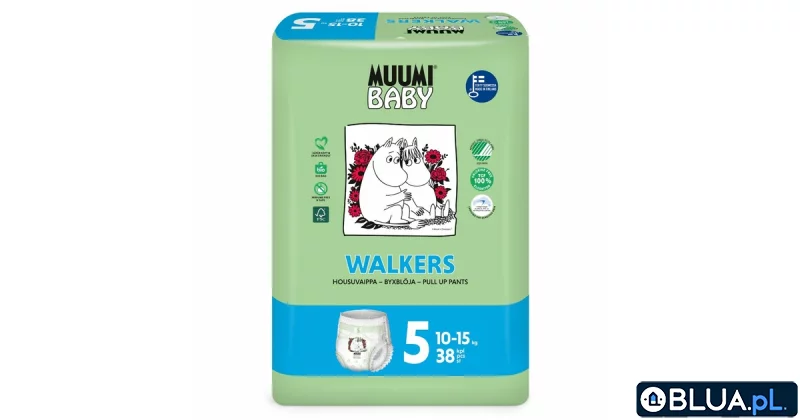 Ekologiczne pieluszki z systemem unikalnych gumek, bez chloru, bez substancji zapachowych, nawilżających i ropopochodnych. Superchłonne. Delikatne dla skóry dziecka, delikatne dla środowiska.Gdy Twoje dziecko umie już samodzielnie chodzić lub raczkować nadchodzi czas, by zmienić peluszki na pieluchomajtki. Pieluchomajtki są również wygodniejsze w przypadku nauki korzystania z nocnika lub toalety. Zwykłe zapinane na rzepy pieluszki mogą być kłopotliwe w przypadku próby szybkiego ich ściągnięcia i ponownego zakładania. Najlepszym rozwiązaniem jest wówczas użycie pieluchomajtek, które łączą funkcjonalność pieluszki i majteczek i uczą małe dzieci korzystania z bielizny (ściągania i zakładania majteczek). Fińska rodzinna firma Delipap Oy znana z doskonałych pieluszek Muumi Baby ma również w swojej ofercie doskonałe pieluchomajtki dla dzieci raczkujących i starszych. Ekologiczne pieluchomajtki WALKERS 5 przeznaczone są dla małych dzieci o wadze od 10 do 15 kg. Są polecane szczególnie dla dzieci z wrażliwą skórą skłonną do podrażnień lub reakcji alergicznych. Jeśli zaobserwowaliście u Waszych dzieci niepokojące objawy alergii skórnych lub odparzeń po użyciu innych pieluszek, to pieluszki Muumi Baby Walkers 5 będą doskonałym rozwiązaniem Waszych problemów. Te wyjątkowe, wysokiej jakości pieluszki, produkowane w Finlandii, wykonane są wyłącznie z czystych i bezpiecznych surowców. W procesie ich produkcji do wybielania masy celulozowej nie używa się agresywnego chloru, którego śladowe ilości pozostają w typowych pieluszkach, lecz tlenu przyjaznego zarówno dla skóry dziecka jak i środowiska. Pieluszki Muumi Baby nie są nasączone żadnym kremem ani substancjami zapachowymi. Ich miękka powierzchnia wewnętrzna wykonana jest z materiału przepuszczającego powietrze. Warstwa zewnętrzna przypomina w dotyku tkaninę, a szczelne ściągacze przy nóżkach idealnie zapobiegają przeciekaniu zawartości. Doskonałe własności hipoalergiczne pieluszek Muumi Baby są efektem wieloletniej współpracy producenta z fińską Federacją ds. Astmy i Alergii (Allergy and Asthma Federation) co potwierdza certyfikat przyznany przez tę organizację. Walory delikatnych i hipoalergicznych pieluszek Muumi Baby doceniają tysiące mam i ich dzieci od Ameryki Północnej do Nowej Zelandii. Produkty Muumi Baby cenione są jeszcze z jednego powodu. Wszyscy rodzice którym nie jest obojętny los naszego środowiska wybierają je, ponieważ mają zaufanie do ekologicznego procesu ich wytwarzania oraz materiałów z których są one wytworzone. Ekologiczne walory pieluszek Muumi Baby potwierdzone są symbolem Nordic Swan będącym skandynawskim odpowiednikiem unijnego symbolu ekologicznego EU Ecolabel. Wybierając ten produkt rodzice mają pewność, że ich pociechy będą nie tylko zdrowe i szczęśliwe ale również będą żyły w czystszym i zdrowszym środowisku. CECHY PORODUKTU:- dla małych dzieci od 10 do 15 kg, - hipoalergiczne- wykonane z czystej celulozy- nie powodują podrażnień- bardzo chłonne- delikatne jak bawełna- doskonale przylegające dzięki unikalnemu systemowi gumek- bezpieczne dla skóry dziecka i środowiska- pozbawione jakichkolwiek substancji zapachowych i kremów- bielone czystym tlenem, bez użycia chloru- bez lateksu, formaldehydu, ftalanów i substancji ropopochodnych- przebadane dermatologicznie- łatwe zakładanie i zdejmowanie- opakowanie pieluszek Muumi wykonane jest z materiału ulegającego biodegradacji i może być wykorzystane jako worek na odpady biodegradowalne