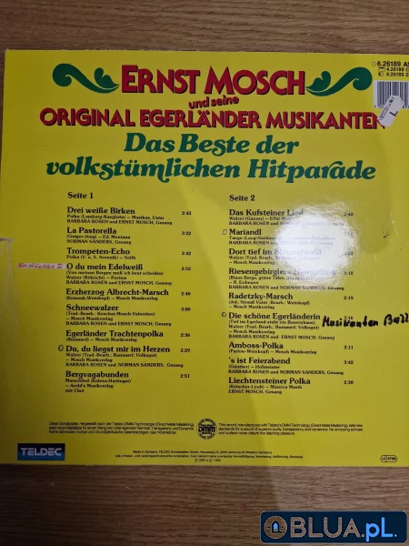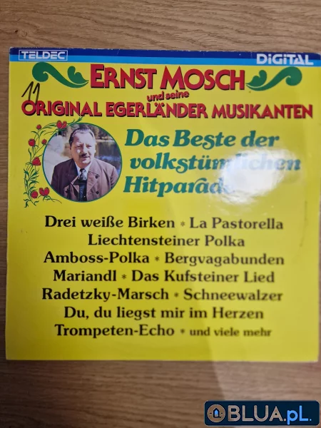 Płyta Winylowa Ernst Mosch i jego Oryginalni Muzycy z Egerlandu – Najlepsze z Volkstümlichen Hitparade Wstęp Witaj w naszej ofercie! Dzisiaj prezentujemy wyjątkowy produkt, dla wszystkich miłośników winyli i muzyki volkstümlichen. To płyta winylowa Ernst Mosch und seine Original Egerländer Musikanten, wydana w 1985 roku. Wykonawca Ernst Mosch, to jeden z najbardziej znanych i uznanych niemieckich muzyków volkstümlichen. Jego oryginalna egerländer muzyka, zyskała sobie rzesze wiernych fanów i jest uważana za jedno z najważniejszych dzieł w tej dziedzinie. Album Album „Das Beste der Volkstümlichen Hitparade”, to zbiór największych przebojów Ernsta Moscha i jego zespołu. Zawiera on utwory, które zdobyły serca słuchaczy i stały się prawdziwymi klasykami. Każdy kawałek, to wspaniała podróż w czasie, pełna radości, muzycznej ekspresji i niezapomnianych wrażeń. Zawartość albumu Album zawiera wiele uwielbianych przez fanów utworów, takich jak „Egerländer Marsch”, „Ein Prosit der Gemütlichkeit” czy „Auf der Vogelwiese”. Każdy z nich, to prawdziwa uczta dla uszu i wspaniała lekcja historii muzyki volkstümlichen. Wydawca Płyta winylowa została wydana przez wytwórnię EMI. To jeden z najważniejszych i najbardziej uznanych wydawców muzycznych na świecie, z długą historią i tradycją. Wydawca gwarantuje najwyższą jakość i trwałość produktu. Podsumowanie Jeśli jesteś miłośnikiem tego typu muzyki, to ten album będzie dla Ciebie prawdziwym skarbem. Nie czekaj dłużej, kup już dziś płytę winylową Ernst Mosch Und Seine Original Egerländer Musikanten – „Das Beste Der Volkstümlichen Hitparade”! A1 Drei Weißen Birken 2:43 A2 La Pastorella 3:22 A3 Trompeten-Echo 2:42 A4 O Du Mein Edelweiß 2:53 A5 Erzherzog Albrecht-Marsch 2:40 A6 Schneewalzer 3:00 A7 Egerländer Trachtenpolka 2:36 A8 Du, Du Liegst Mir Im Herzen 2:29 A9 Bergvagabunden 2:51 B1 Das Kufsteiner Lied 2:40 B2 Mariandl 2:56 B3 Dort Tief Im Böhmerwald 2:22 B4 Riesengebirglers Heimatlied 3:10 B5 Radetzky- Marsch 2:19 B6 Die Schöne Egerländerin 3:16 B7 Amboss-Polka 2:11 B8 'S Ist Feierabend 3:42 B9 Liechtensteiner Polka 2:38