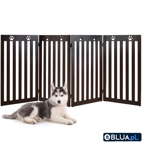 Bramka bezpieczeństwa 4-panelowa osłona dla psa Nasza bramka zapobiega przedostaniu się psa do danego pomieszczenia lub na piętro domu. Zapewnia twojemu czworonożnemu przyjacielowi bezpieczeństwo i chroni twoje meble przed zniszczeniem. Metalowe zawiasy 360° umożliwiają dowolną konfigurację paneli, dzięki czemu z łatwością zabezpieczysz każdą przestrzeń, np. schody, kuchnię lub sypialnię. Małe przerwy pomiędzy szczeblami i odpowiednia wysokość bramki skutecznie powstrzymują zwierzaka przed wtargnięciem do niedostępnej dla niego strefy. Możliwość szybkiego złożenia i przechowywania w niewielkim kącie pozwala zaoszczędzić mnóstwo czasu i energii. Pokrycie wodoodporną farbą gwarantuje trwałość, a antypoślizgowe podstawki zwiększają stabilność konstrukcji. Wolnostojąca konstrukcja: Nasza bramka zdecydowanie wyróżnia się na tle innych produktów tego typu. Jej montaż nie wymaga wiercenia w ścianie - wystarczy postawić ją w wybranym miejscu, aby czworonożny przyjaciel nie przedostał się poza wyznaczoną strefę. Łatwe składanie i przenoszenie: Cztery panele połączone są za pomocą metalowych zawiasów 360°, które umożliwiają ich dowolną konfigurację. Z naszym produktem z łatwością zabezpieczysz każdą przestrzeń. Kompaktowe wymiary po złożeniu ułatwiają przechowywanie i przenoszenie bramki. Skuteczne zabezpieczenie: Nasza bramka zapobiega przedostaniu się psa do danego pomieszczenia. Możesz umieścić ją w wejściu do kuchni, przed schodami lub w drzwiach balkonowych, tak aby powstrzymać swojego zwierzaka przed wtargnięciem do niedostępnej dla niego strefy. Mocna konstrukcja: Dzięki wykonaniu z płyty MDF i pokryciu wodoodporną farbą bramka jest trwała i odporna na upływ czasu. Antypoślizgowe podstawki zwiększają stabilność i chronią podłogę przed zarysowaniami. Prosta forma sprawia, że bramka idealnie komponuje się z każdym wystrojem. Dla psów różnych ras: Wymiary bramki po rozłożeniu wynoszą 203 x 89,5 x 1,5 cm, dzięki czemu nadaje się ona zarówno dla mniejszych, jak i dużych psów. Montaż naszego produktu nie sprawi ci trudności - wszystkie potrzebne części zostały dołączone do zestawu. Opakowanie zawiera: 1 x Bramka dla zwierząt 1 x Instrukcja obsługi