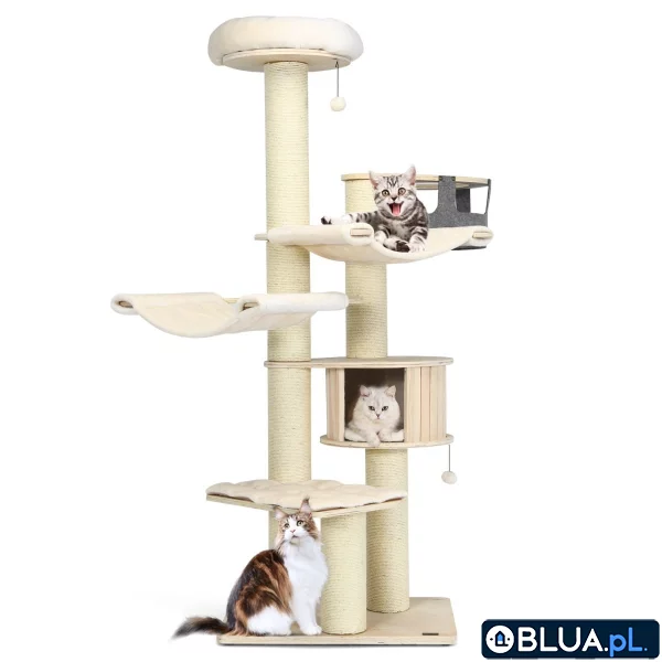 Nasz drapak to prawdziwy raj dla kota. Budka z miękką poduszką będzie przytulnym miejscem do odpoczynku oraz świetną kryjówką podczas zabawy i polowania. Półki, legowiska i hamaki zmobilizują mruczka do wspinania się i szaleństw. Umożliwią także obserwację świata za oknem lub wygrzewanie się w słońcu. Sizalowe słupki zachęcą kota do ostrzenia pazurków i dzikich harców. Możesz przestać zamartwiać się o meble - twój pupil z pewnością pokocha swój nowy drapak i przestanie niszczyć kanapę. Kup go już dziś i podaruj czworonożnemu przyjacielowi prawdziwe centrum dowodzenia. Wielofunkcyjny mebel dla kotów: Górne legowisko na wysokości 197 cm to doskonały punkt obserwacyjny. Wiszący kosz, miękkie hamaki i liczne półki zachęcą kota do zabawy i zagwarantują mnóstwo miejsca na odpoczynek. Zaspokojenie kocich instynktów: Sizalowe słupki zmobilizują twojego pupila do ostrzenia pazurków. Dzięki temu przestaniesz martwić się o swoje nowe meble. Wielopoziomowa konstrukcja pozwoli na długie godziny szaleństw. Zakup na lata: Pokrycia legowisk można zdjąć i wyprać w pralce, aby zawsze wyglądały jak nowe. Drapak wykonany jest z najwyższej jakości materiałów, co gwarantuje niezrównaną trwałość i odporność na upływ czasu. Stabilna konstrukcja: Nasz produkt jest wyjątkowo solidny - kot może bezpiecznie skakać i bawić się bez ryzyka, że drapak się przewróci. Masywna, szeroka podstawa gwarantuje też dużą nośność. Najlepszy prezent dla pupila: Nasz drapak pomoże zaspokoić wszystkie podstawowe potrzeby twojego czworonożnego przyjaciela. Polecamy umieścić go przy oknie, tak aby kot mógł obserwować świat i wylegiwać się w promieniach słońca. Produkt wysyłany w dwóch paczkach.