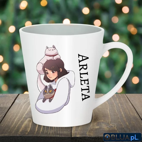 Kubek do latte z nadrukiem dla miłośników kotów i indywidualnym imieniem, to świetny pomysł na prezent na Mikołajki lub Święta dla przyjaciółki, siostry, męża, brata itp.