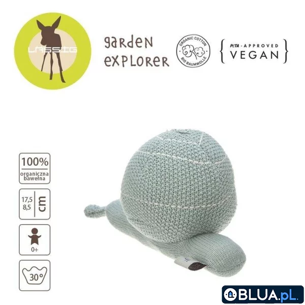 Śliczna i praktyczna dziergana przytulanka z grzechotką niemieckiej marki LASSIG to idealna pierwsza zabawka nie tylko dla małych miłośników przyrody. Miękki, urokliwy ślimak z różkami i muszelką-domkiem na grzbiecie w kolorze szarozielonym wykonany został z wegańskiej bawełny organicznej. Jest bardzo przyjemny w dotyku, a przy potrząsaniu wydaje miły dla ucha dźwięk. Zabawa nim stymuluje dziecięcy zmysł słuchu i dotyku, trenuje chwyt oraz koordynację ręka-oko. Rozmiarami jest idealnie dopasowany do małych rączek. Stanowi część większej kolekcji Garden Explorer. Możesz dobrać do niego inny produkt w tej samej gamie kolorystycznej lub z tym samym motywem. O kolekcji W kolekcji Garden Explorer maluchy odnajdą przedmioty, typowe dla podwórka, ogrodu czy wsi, m.in. urokliwego ślimaczka, słodką pszczółkę, interesujący traktor oraz wiele motywów roślinnych. Ich zadaniem jest pobudzenie dziecięcej ciekawości do odkrywania świata wokół nich, a także sprawienie, by wszystkie codzienne czynności stały się o wiele przyjemniejsze: czy to posiłek, czy popołudniowa drzemka. Można prać w pralce, w temp. max 30°C, w delikatnym cyklu. Wiek: 0 m+ Wymiary: 17,5 x 7 x 8,5 cm Waga: 35 g Skład: 100% bawełna organiczna, wypełnienie: 100% poliester Lassig to rodzinna firma z Niemiec, tworząca z myślą o współczesnych Mamach, które są świadome swojego stylu, potrzeb i roli społecznej. To nie tylko gwarancja perfekcji i dobrego designu, ale również ekologicznej produkcji i wyboru materiałów. W oparciu o te idee, dbałość o środowisko i szeroko rozumianą odpowiedzialność społeczną marka wypracowała sobie własną filozofię. LIVE LASSIG oznacza zwyczajne życie: rodzinne, pełne ciepła i tradycyjnych wartości, szacunku dla natury i drugiego człowieka. Takie podejście zaowocowało szeregiem branżowych nagród, w tym za innowacyjność i etykę. Ponadto marka Lassig aktywnie wspiera chore dzieci, promuje wychowanie bez przemocy, finansuje szkółki piłkarskie dla maluchów, jak również ratuje zagrożone gatunki zwierząt.