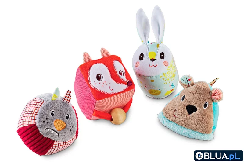 Klocki – zwierzątka to niebanalne, miękkie i wielofunkcyjne źródło rozrywki i nauki dla ciekawskich maluszków. Każdy z 4 elementów zestawu to inny bohater, uszyty jest z materiałów o różnych wzorach i fakturach, reprezentuje inną figurę geometryczną oraz posiada wiele ukrytych funkcji. Niedźwiadek Cesar ma kształt puchatej piramidy z grzechotką, ma odstające uszka i aplikację z owadem. Królik Celestin to walec z długimi uszami i transparentną grzechotką z kolorowymi piłeczkami od spodu. Wilczek Nicolas jest kulą z bezpiecznym, giętkim lusterkiem i grzechotką, a Lisiczka Alice to szeleszczący sześcian z drewnianym koralikiem do przesuwania po pluszowej linie. Zabawka jest solidnie wykonana i w pełni bezpieczna. Zaskakuje i pobudza dziecięcą wyobraźnię. Rozwija małą motorykę (chwytanie, potrząsanie, rzucanie, przesuwanie), aktywizuje zmysły wzroku, dotyku i słuchu (dzwonienie, grzechotanie) oraz uczy rozpoznawania kształtów. Do tej zabawki możesz dobrać inne z tymi samymi bohaterami. Idealnie nadaje się na prezent. Można prać w pralce w temperaturze do 30°C w delikatnym cyklu.