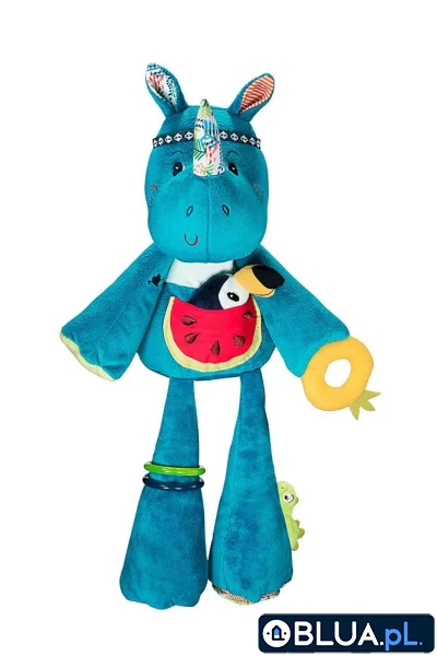 Przytulanka aktywizująca Nosorożec Marius to niebanalne, miękkie i wielofunkcyjne źródło rozrywki i nauki dla ciekawskich maluszków. Przytulanka jest pełna niespodzianek. Na grzechoczącej głowie ma opaskę z tasiemki i kolorowy róg, na który można nakładać trzymane w lewej łapce kółko-ananasa. W kieszonce na brzuszku schowany jest mały tukan na elastycznej tasiemce. Na prawej nóżce Mariusa umieszczone są dwie kolorowe obręcze, które mogą pełnić rolę gryzaków, na lewej zaś – bezpieczne, giętkie lusterko. Dodatkowo nóżka szeleści przy chwytaniu. Zabawka jest solidnie wykonana i w pełni bezpieczna. Zaskakuje i pobudza dziecięcą wyobraźnię. Rozwija małą motorykę (chwytanie, potrząsanie, wkładanie, wyciąganie), aktywizuje zmysł słuchu (szeleści, grzechocze), wzroku (lusterko), dotyku, a dzięki gryzakom – przynosi ulgę w trudnym okresie ząbkowania. Do tej zabawki możesz dobrać inne z tym samym bohaterem. Idealnie nadaje się na prezent. Można prać w pralce w temperaturze do 30°C w delikatnym cyklu.