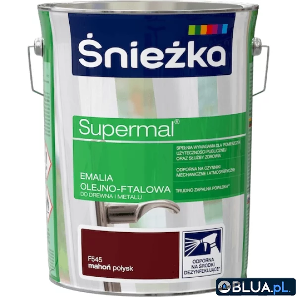 SUPERMAL® Emalia olejno-ftalowa stosowana jest do dekoracyjno-ochronnego malowania drewna, materiałów drewnopochodnych, tynków oraz elementów stalowych i żeliwnych użytkowanych wewnątrz i na zewnątrz pomieszczeń, takich jak: okna, drzwi, meble, ogrodzenia, lamperie itp. Polecana do stosowania w pomieszczeniach mieszkalnych, przeznaczonych na stały pobyt chorych w budynkach służby zdrowia oraz przeznaczonych na stały pobyt dzieci i młodzieży w budynkach oświaty, a także w pomieszczeniach przeznaczonych do przechowywania produktów żywnościowych (bez bezpośredniego kontaktu z żywnością). Emalia odporna na środki dezynfekujące*. Spełnia wymagania pomieszczeń użyteczności publicznej i służby zdrowia. Odporna na czynniki mechaniczne i atmosferyczne. Trwałe i żywe kolory. Doskonała wydajność i krycie. Trudno zapalna powłoka - klasa palności D-s1, d0. *badania przeprowadzono na wybranych próbkach dezynfektantów