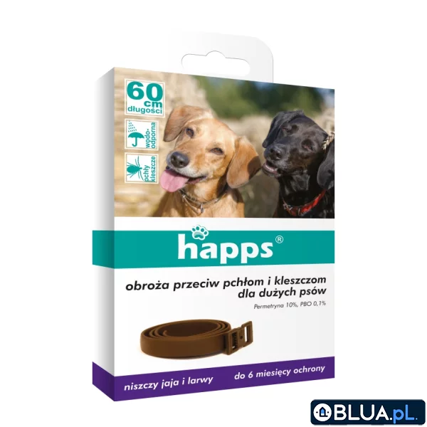 Obroża Happs przeciw pchłom i kleszczom dla dużych psów zapewnia skuteczną i długotrwałą ochronę przez groźnymi kleszczami i pchłami.