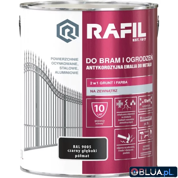 RAFIL DO BRAM I OGRODZEŃ to antykorozyjna emalia, która przeznaczona jest do ochronno-dekoracyjnego malowania powierzchni metalowych. Tworzy trwałą i elastyczną powłokę odporną na uderzenia. Długotrwale chroni przed korozją, szczególnie polecane do malowania bram, ogrodzeń, balustrad, metalowych mebli ogrodowych. Charakteryzuje się zwiększoną odpornością na działanie trudnych warunków atmosferycznych.