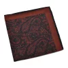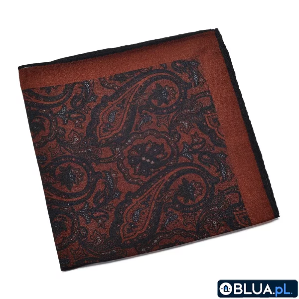 Brązowa poszetka VAN THORN w granatowy wzór turecki. Poszetka ma również granatową obwódkę. Wykonana jest z delikatnej i cienkiej welny, dzięki czemu ładnie układa się w brustaszy. Będzie pasować zarówno do garnituru, jak i mniej formalnej stylizacji, np. z marynarką i swetrem. Idealnie nadaje się na prezent dla eleganckiego mężczyzny. Poszetka ma ręcznie rolowane brzegi. Materiał: Wełna 100%