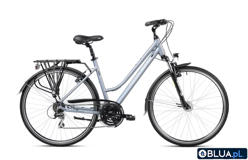 Model wyróżniający się dużą uniwersalnością, który sprawdzi się zarówno jako model użytkowy, czy służący do turystyki rowerowej. Sercem Gazeli jest aluminiowa rama specjalnie zaprojektowana z myślą o kobietach. Jest lekka i wygodna w codziennym użytkowaniu. Poprowadzenie przewodów wewnątrz ramy skutecznie wydłuża ich żywotność, a także pozytywnie wpływa na estetykę całości. Gazela 3 jest modelem trekkingowym bez kompromisów. To solidna maszyna, której specyfikacja jest kompletna. Dzięki amortyzatorowi przedniemu SR Suntour M3010 i amortyzowanej sztycy jazda nawet po wyboistej trasie jest wyjątkowo komfortowa. Pozycja na rowerze jest komfortowa, a jej ustawienie ułatwia regulowany wspornik kierownicy. Gwarancją płynności jazdy jest napęd legendarnej marki Shimano. Grupa Shimano Acera oferująca 21 biegó to pewność działania i szeroki zakres przełożeń. Ma to kluczowe znaczenie zwłaszcza kiedy teren zacznie robić się trudniejszy i pojawią się pierwsze wzniesienia, które trzeba pokonać. W specyfikacji modelu znajdziemy również mnóstwo dodatków przydatnych w codziennej eksploatacji jak i podczas ambitniejszych dystansów. Solidny bagażnik zdolny przewieżć naprawdę dużo, komplet błotników wraz z przednim i tylnym oświetleniem. Model wyposażony został również w stopkę, która ułatwi postoje i odpoczynek. Gazela 3 występuje w 3 rozmiarach i 2 wersjach kolorystycznych.