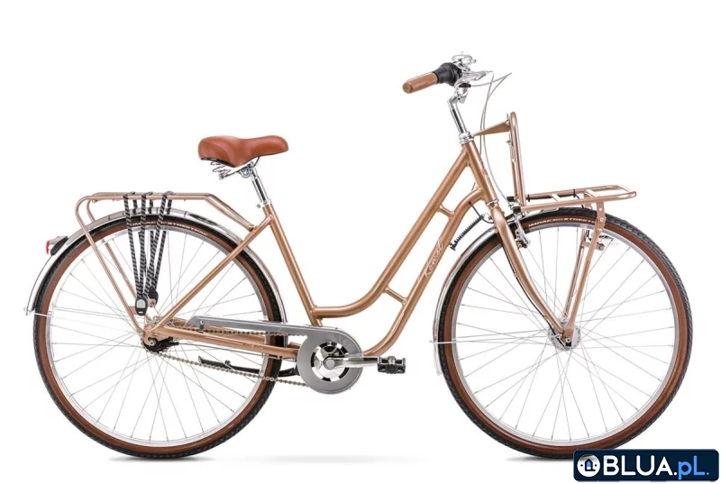 Luiza Lux to model wchodzący w skład serii Klasyka. To nasza propozycja dla szukających wyjątkowej funkcjonalności w parze z klasycznym miejskim stylem. Aluminiową ramę pomalowaliśmy na mokro lakierem metalicznym co pozwoliło na uzyskanie głębokiego piękna barw. Górna rura schodzi gwałtownie w dół co ułatwia wsiadanie i zsiadanie nawet w zwiewnych sukienkach. Elegancki i nowoczesny Romet Luiza Lux w złocistym kolorze to nie tylko stylowe podróżowanie. To również wygoda codziennego użytkowania m.in. za sprawą 7 biegowego napędu Shimano Nexus gwarantującego bezobsługową eksploatację. To co odróżnia Luizę od pozostałych rowerów grupy CITY to zamontowany na stałe przedni oraz tylny bagażnik zamontowane w formie sztywnego stelaża. Dzięki zastosowaniu dynama w piaście Shimano, które zasila przednie i tylne oświetlenie, poziom naszego bezpieczeństwa wzrasta, zwłaszcza kiedy jeździmy po zmroku. Stylowy dzwonek w rowerze miejskim to bardzo pożądany gadżet, podobnie jak uchwyt na kubek ulubionej kawy.