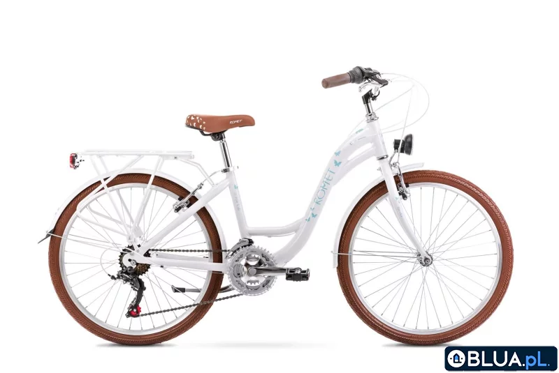 Podaruj dziecku prezent, który stanie się początkiem pasji, wspólnych przygód i zdrowych nawyków na całe życie. Poznaj Romet Panda 1! Ten model należy do serii Romet Junior, w której stworzyliśmy rowery dla najmłodszych, zróżnicowane pod względem rozmiaru ram, kół i wyposażenia. Ten model to idealny prezent, szczególnie dla dziewczynki. Wiemy, ile zainteresowania wzbudzają wśród nich nasze modele CITY – dlatego przygotowaliśmy piękny, w pełni funkcjonalny odpowiednik dla młodszych. Romet Panda 1 prezentuje się pięknie, a przy tym zachowuje wysoką jakość, o czym świadczy m.in. dożywotnia gwarancja na ramę. Macie do wyboru dwie śliczne wersje kolorystyczne: biało-niebieską i wrzosowo-białą. Rowerek ma napęd Shimano z bardzo szerokim zakresem biegów: aż 21 przełożeń. Dzięki temu dziewczynka naturalnie nauczy się optymalnego dopasowania prędkości i oporu. Aby zapewnić pełne bezpieczeństwo, wyposażyliśmy rowerek dziecięcy Romet Panda 1 w światła z przodu i z tyłu oraz mocne hamulce. Dodatkowo zamontowaliśmy bagażnik na potrzebne drobiazgi, błotniki i stopkę. Jeśli zastanawiasz się, jak dopasować rower do wzrostu dziecka, weź pod uwagę wielkość kół i ramy. Romet Panda 1 to rowerek 24”, co oznacza, że jest najlepszy na 135-155 cm. Pamiętaj, żeby dobierać model, kierując się wzrostem dziecka. Zaprojektowaliśmy geometrię tak, aby od najmłodszych lat kształtować poprawne nawyki i pozycję.